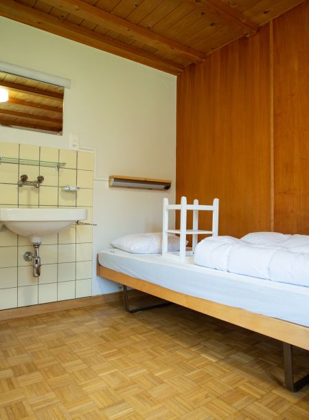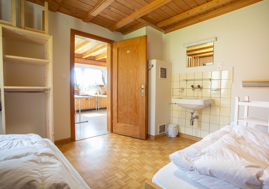 - Schlafzimmer mit 2 Einzelbetten und Lavabo mit fliessend Kalt- und Warmwasser